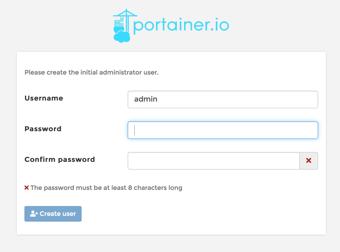 1. The first time you go to the Portainer page, you will be presented with the message "Please create the initial administrator user.". Fill in your preferred admin username and password. Click Create User.