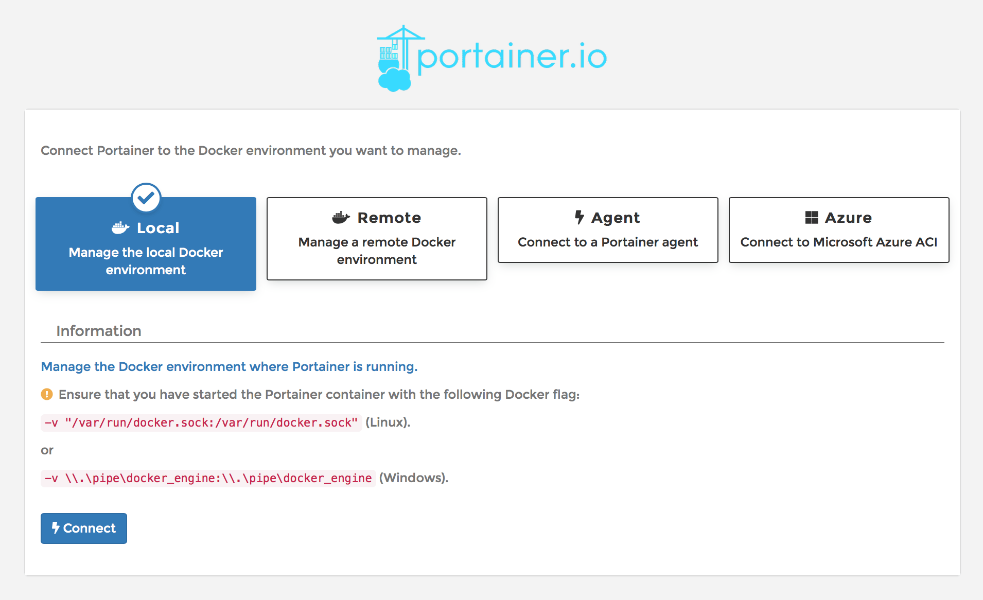 3. On the "Connect Portainer to the Docker environment you want to manage." screen, select Local: Manage the local Docker environment and click Connect.